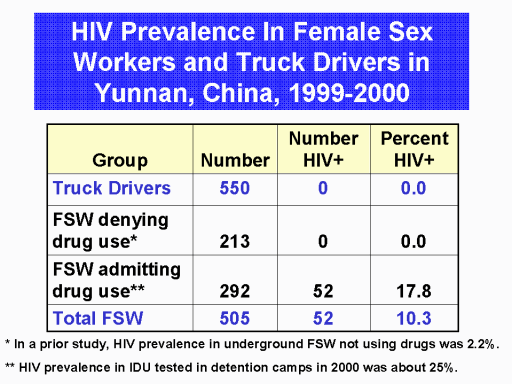 This should not be interpreted to mean that there is no public health threat of HIV transmission from HIV+ FSW to their clients, but this finding reinforces the low risk of HIV transmission via vaginal intercourse from an infected female to a susceptible male. As of 2007, there are no definitive data to suggest that any significant heterosexual HIV epidemic has occurred in Yunnan. |