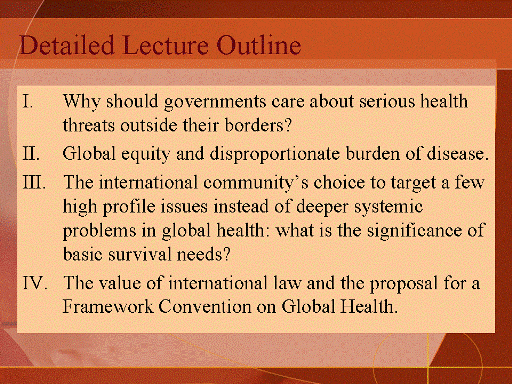 This lecture first inquires why governments should care about serious health threats outside their borders, and explores the alternative rationales. Second, I examine the compelling issue of global health equity, and ask whether it is fair that people in poor countries and regions suffer such a disproportionate burden of disease, disability, and premature death. Third, I describe how the international community focuses on a few high profile, heart-rending, issues while largely ignoring deeper, systemic problems in global health. By focusing on basic survival needs, the international community could dramatically improve prospects for the world’s population. Finally, I explore the value of international law itself, and propose an innovative mechanism for global health reform—a Framework Convention on Global Health.