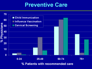 | This graph and the following two graphs, summarize the results for each indicator as: the distribution of physicians according to the proportion of their patients that received the recommended care. For example, for nearly half (49%) of the physicians included in the childhood immunization, between 50 and 74% of their eligible patients completed their vaccination schedules. |