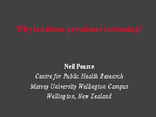 Professor Pearce has recently established, and been appointed Director, of the Centre for Public Health Research at the Massey University Wellington Campus. Since the completion of his PhD in epidemiology in 1985 he has been engaged in a wide range of public health research activities. During 1980-1988 his main research interest was in occupational epidemiology, and during this time he co-authored the leading textbook of occupational epidemiology, published by Oxford University Press in 1989. In 1988 he co-founded the Wellington Asthma Research Group (WARG) at the Wellington School of Medicine. He conducted a wide range of research projects including the identification of the role of the asthma drug fenoterol in the New Zealand asthma mortality epidemic, studies of the management of asthma in the community, and more recently studies of the causes of the increases in asthma prevalence in New Zealand and worldwide. He has authored a textbook of asthma epidemiology which was published by Oxford University Press in 1998. His new Centre will be conducting a wide range of public health research including respiratory disease, cancer, diabetes, Maori health, Pacific health and occupational and environmental health research. |