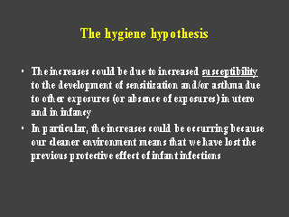 This evidence has given rise to the “hygiene hypothesis” which argues that increases in asthma prevalence are due to changes in immune function, because our cleaner environment means that we have lost the previous protective effect of infant infections. |