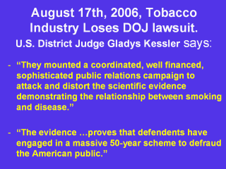 | Now bringing us up to date, we have the industry losing the Department of Justice law suit and being found guilty of racketeering and committing fraud on the American public. In her 1700 page opinion, judge Kessler also concluded that if remedies were not imposed, there was every reason to expect these offences to continue. |