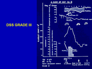 Classical dengue shock syndrome (incorrectly labeled as grade II) illustrated by narrow pulse pressure at time of peak elevation of hematocrit (hypovolemia) thrombocytopenia, pleural effusion after initiating fluid repletion. Note short time course, complete reversal of vascular leak within hours. There is grave danger in overhydration.