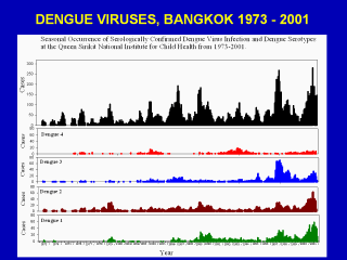 | Distribution of confirmed hospitalized DHF cases at 2 month intervals from 1973 through 2001. There has been general upward trend with larger outbreaks at occuring at 2 – 5 year intervals. Peak hospitalization rates occur during the rainy season month of July – August. Colored graphs show isolations of different dengue viruses demonstrating off-set outbreaks of DENV 3 and 4 compared with DENV 1 – 2. |
