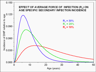 | This shift in age at occurrence of second dengue infections where four dengue viruses circulate is diirectly related to force of infection (infection rate). Low annual infection rates retard the probability of experiencing second dengue infections compared with higher infection rates. |