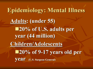and determinants of disease frequency in human populations (McMahon & Pugh). Study results are from 2 epdemiologic surveys: Epidemiologic Catchment Area (ECA) study of early 80’s and (b) National Comorbidity Survey (NCS) of early 1990’s. Used DSSM categories. For adults: SIMPLE PHOBIA (8.3%) and ANY MOOD DISORDER (7.1%) lead. For children ages 9-17: ANXIETY DISORDERS (13%) and DISRUPTIVE DISORDERS (10%) lead. |