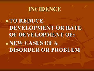 families, academic failure, depression Incidence is the number of new cases of a disorder that come into being at a point in time. Incidence rate is the number per specified unit of population. Prevalence is the total number of cases at a point in time. It is a census count. Prevalence=Incidence x Duration. Most of our interventions are prevalence oriented. To reduce the existing number by attacking duration of the disturbance (shortening it) or making the disturbance more manageable. Does nothing to address onset. |
