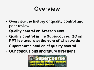 find out more about quality control studies in the Supercourse: 1. Linkov F, Lovalekar M, LaPorte R Quality Control of Epidemiological Lectures On-line: Scientific Evaluation of Peer Review Croatian Medical Journal Croat Med J. 2007 Apr;48(2):249-55. 2. Linkov F, Lovalekar M, Laporte R. Scientific Journals are 'faith based': is there science behind Peer review? J R Soc Med. 2006 Dec;99(12):596-8. 3. Laporte RE, Omenn GS, Serageldin I, Cerf VG, Linkov F. A Scientific Supercourse Science. 2006 Apr 28;312(5773):526. 4. Linkov F, LaPorte R, Lovalekar M, Dodani S Web Quality Control for Lectures: Supercourse and Amazon.com. Croat Med J. 2005 Dec;46(6):875-8. |
