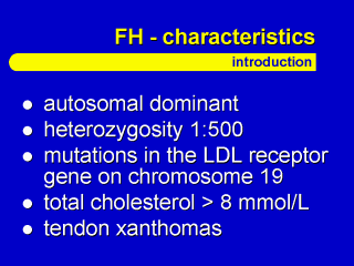 | FH is an autosomal dominantly inherited disorder of lipid metabolism. Heterozygosity has an estimated prevalence of 1:500. It is caused by mutations in the LDL receptor gene. Total and LDL cholesterol are severely increased. Generally the triglyceride levels are normal. Tendon xanthomas (in particular Achilles' tendons) are pathognomic, but atheromas are the most important consequence of the disorder. |