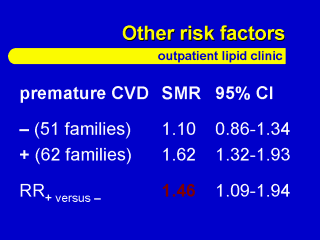 | The risk of death of families referred with symptom onset of cardiovascular disease relative to families without premature cardiovascular disease was 1.46. This indicates a strong effect of other risk factors for cardiovascular disease on mortality from the disorder. |