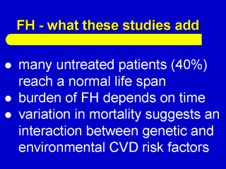 | The old studies did not estimate mortality from FH accurately as a result of selection on cardiovascular disease: about 40% of the untreated FH patients reach a normal life span. Moreover, the SMR was normal in the 19th century and rose with a peak in the 1930s to 1960s. Hypercholesterolemia probably enhances the effect of other risk factors for cardiovascular disease. |