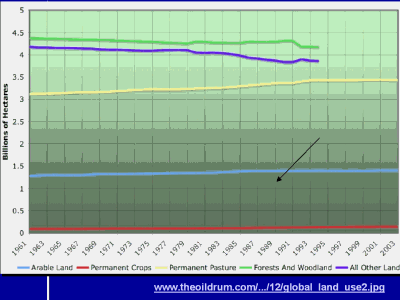 Here’s a sobering factoid: the amount of arable land has not changed appreciably over the past half century – and isn’t likely to in the future because we’re losing it to urbanization, salinization, and desertification as fast as we’re adding it – possibly even faster as the earth heats up. |