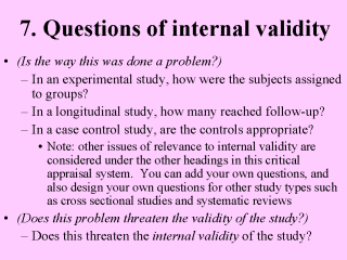 | It is difficult to include all possible sources of bias that might threaten the internal validity of a study, and you are welcome to add your own favourites. The ones included in this side are those that might be considered as citiical for these types of study. |