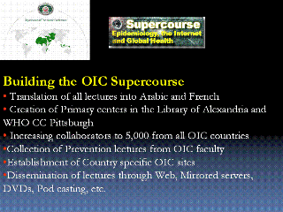 A OIC supercourse is needed.  To accomplish this we will first translate all the lectures into Arabic and French. The reason for this is that the lectures should not only be used by those in health, but they should be used in disciplines such as immunology, history, education, nutrition, nursing, etc.  Our lectures are thus not targeted exclusively for physicians, but rather for all teachers in higher education.  The two central organizing centres will be at the Library of Alexandria in Egypt, and the World Health Organization Collaborating Center in Pittsburgh. We already have had very successful collaboration with each other. This is not a one-way street of knowledge, it is a two way street. Some of the most outstanding lectures we have on disasters have been produced in Iran, we have outstanding lectures on how to develop research from Qatar. These types of lectures have taught many students in China, the US, Europe and Latin America.  We will use various means to disseminate lectures throughout the OIC region as it is critical to bridge the digital divide. We have been using mirrored servers, DVDS, and even paper.