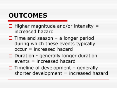 Events which can occur at any time of day throughout the year pose a different hazard than those that are seasonal or that commonly occur during only part of the day. The individual event in a restricted season may be of catastrophic intensity. For example, the Super Typhoon is a greater national hazard than a crash of a passenger aircraft. However, you must maintain readiness to deal with the worst case aircraft crash impact throughout the year. The longer the event duration the greater the hazard. Consider the both the impact and recovery periods, which may be prolonged for weeks, months, or years. A major earthquake happens in seconds, but the combined response and recovery effort may take years.The shorter the timeline for development of the event the higher the hazard. In the earthquake example, absent foreshocks to trigger increased readiness, the time does not allow pre-impact response actions to preserve life and property. On the other hand, given good weather forecasting, a developing winter storm may provide hours or days of warning. |