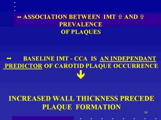 | So, it is possible to conclude that increased wall thickness precede plaque formation and that noninvasive B-mode ultrasonographic measurement of IMT-cca could be considered a useful marker of the development of the carotid atherosclerosis. |