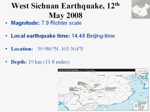 | Distances: 75 km (45 miles) WNW of Chengdu, Sichuan 145 km (90 miles) WSW of Mianyang, Sichuan 345 km (215 miles) WNW of Chongqing, Chongqing 1545 km (960 miles) SW of BEIJING, Beijing http://neic.usgs.gov/neis/eq_depot/2008/eq_080512_ryan/neic_ryan_h.html Source of map: http://www.reliefweb.int |