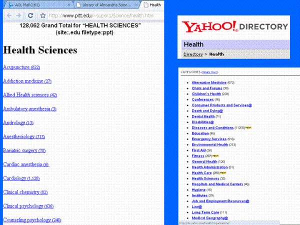 We model the presentation after the Yahoo directory presented on the right.  We chose to make this part look and feel like Yahoo as Yahoo’s directory was built to facilitate browsing. The Scientific Supercourse also is designed to facilitate browsing, for example an expert in diabetes might want to see what is being taught in cardiology.