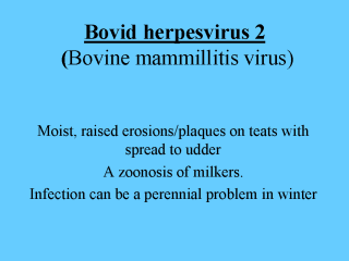 | Diagnosis and control Virus isolation from plaques. Clean teat liners etc There are no vaccines, but there are antivirals for topical treatment where this is considered economical. Vaccines with gE deletions are in use in the EU. They allow distinction between vaccinated and wild type infections by the use of an ELISA against gE with regard to future eradication programmes. |