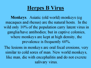 vaccines) from these monkeys has also produced fatal infections. Treatment of zoonosis consists of hyperimmune serum inoculated both at the site of entry and intraperitoneally. Concurrently repeated doses of formalin inactivated virus are given subcutaneously over the abdomen. Prevention of zoonosis. Crush cages and face guards should always be used when handling imported old-world monkeys which should not be housed in groups, why? Monkeys which have been screened for antibodies to this virus are now used in experiments. |
