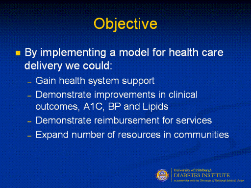 We wanted to first gain UPMC administrative support. Our goal was to demonstrate to our leadership the value of DSME by demonstrating improvements in A1C levels for the health of their patients.  Our health system also owns its own insurer and every drop in A1C level also translates into savings.