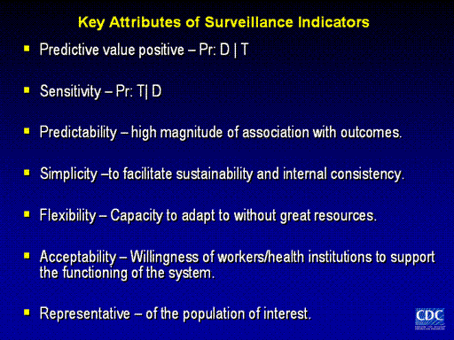 Idealmente, son medidas claros de estatus de salud, o, al menos un factor que influye estatus de salud.  Por eso, indicadores de vigilancia usalmente incluye medidas de [leer], y mas recientemente, economico.  Tambien, es importante que la medida es algo que se puede medir con RELIABILITY Y ACCURACY – for example, tiene alto sensitividad y specificidad.  Es importante que la indicadore representa algo que la sistema de clinica o salud publica puede cambiar.  Y por fin, esperamos que todos arriba tiene un base de ciencia, idealmente de estudios cohortes en poblaciones relaventes y de RANDOMIZED CONTGROLLED TRIALS