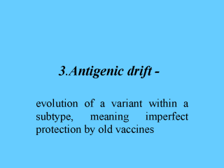 involves escape from neutralisation the variant is selected in infected animals. Drift is detected by 2-4-fold alterations in HI titres between one isolate and another isolate recovered several years later. Drift is now best assessed by panels of mAb in HI tests and nucleotide sequencing of the neutralisation sites on H. These mutations accumulate with time. The human viruses appear to accumulate more mutations than the equine, which may relate to the presence of more people than horses in the world. |