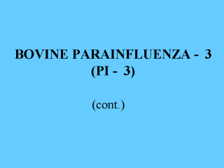 (This applies to both PI3 and BRSV) 4-fold rise in ELISA antibody in paired serum samples from several animals. Virus isolation early in disease. IF on nasal aspirates or bronchial epithelium. Control: Correct ventilation and stocking density; avoid mixing different ages from different locations in same airspace. Current vaccines utilise a temperature sensitive mutant which gives local protection after intranasal inoculation at 34OC and does not replicate at 370C. |