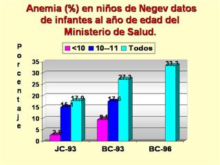 Una muestra regional de 46 clínicas maternas e infantiles (MCH) fue obtenida en 1993. De losa 251 niños judíos (JC) examinados, más de 25% tuvieron anemia. En las 10 clínicas restantes, 187 niños beduinos (BC) al año de edad fueron examinados, y más del 25% tuvieron anemia. Una repetición de las 10 clínicas en 1996 con 691 niños no mostraron reducción en las tasas.