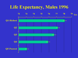| By 1996, the life expectancy of males in Canada's poorest urban neighbourhoods (73.1), though far below that of the other quintiles, was somewhat higher than the national average life expectancy for males in the United States (72.7). |