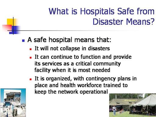 Hospitals and health facilities need to remain functional during disasters. When hospitals are unable to fulfill their emergency function at the time when most needed, critical care is compromised and lives are lost needlessly.