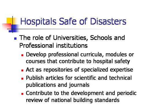 Universities, as well as professional associations of engineers, architects, nurses, medical doctors and others, have a wealth of knowledge and specialized expertise. Add to a global knowledge base or knowledge management system by systematically collecting and sharing this knowledge with established information centres, thus providing a how-to blueprint for countries with similar risks and resources.
