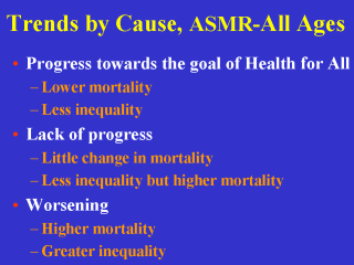 injuries except for motor vehicle accidents and suicide. Other causes of death showed either little change in mortality or less inequality but higher ASMRs. These included lung cancer for males, breast cancer for females, and prostate cancer and suicide for males. Finally, a few other causes of death showed increased mortality together with greater inequality by income. These included lung cancer for females, mental disorders, AIDS, and ill-defined conditions for both sexes. Note that for a few causes of death, the usual gradient was inverted, with the highest mortality in the richest quintile. Such causes included breast cancer for women, prostate cancer for men, and motor vehicle occupants of both sexes.