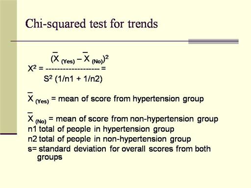 For example, we reviewed, X2= (2.1 – 1.99)2 /0.0672 (1/150 + 1/310) = 275 with a 1 degree of freedom p<0.05 With this result, we reject the null hypothesis and say that there is strong evidence that there is a trend. |