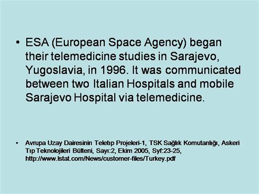 Avrupa Uzay Dairesinin Teletıp Projeleri-1, TSK Sağlık Komutanlığı, Askeri Tıp Teknolojileri Bülteni, Sayı:2, Ekim 2005, Syf:23-25, http://www.lstat.com/News/customer-files/Turkey.pdf |