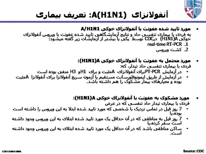 کسانی که بیش از 7 روز بیمار هستند باید بالقوه مسری در نظر گرفته شوند تا زمانی که علایم بهبود یابند.کودکان به خصوص کودکان کم سن تر می توانند بالقوه برای مدت طولانی تری مسری باشند.مدت عفونت ممکن است بر حسب نژاد ویروس آنفولانزای خوکی A(H1N1) متفاوت باشد. Reference: MMWR: Prevention and Control of Influenza: Recommendations of the Advisory Committee on Immunization Practices (ACIP), 2008. |