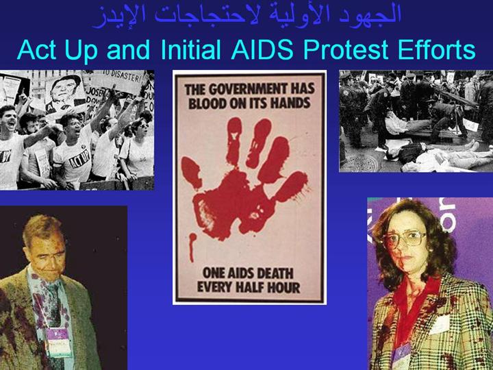 http://www.positivenation.co.uk/issue120/treatments/treatment3/treatment3.htm Paul Volberding and Margaret Fischl appear with fake blood spilt on them by activists at the Vancouver International AIDS Conference in 1996 Initial Act Up efforts in the US, including a die-in |