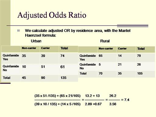 Raw OR is 8.89; in urban area is 4.58 and in rural area is 19.5. Although in both areas was modify the OR, it follow being statistical significative. Mantel Haenzsel OR is 7.4; this is meaning that residence area is a confounder for the association between quinfamide and non-carrier of E. histolytic. Controlling by residence area, disminish estimate of OR; residence area is a positive confounder. |