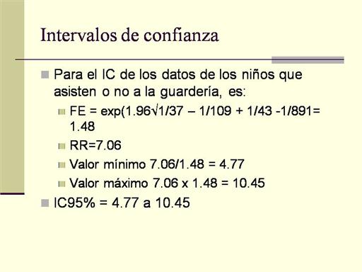 RR Razón de riesgos FE Factor de error La interpretación del IC95% es que tengo 95% de confianza de que la la Razón de Riesgos en la población está entre 4.77 y 10.45. Este cálculo es adecuado con gran tamaño de muestra. |