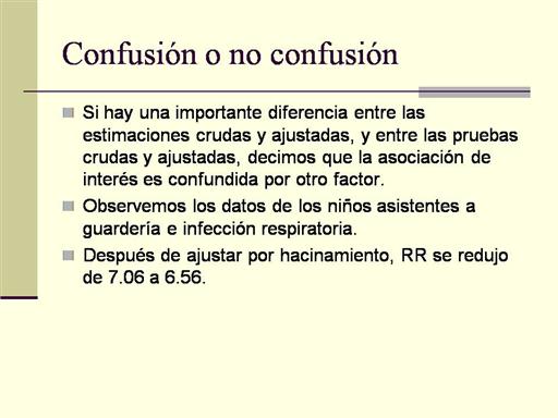 La asociación entre asistencia a guardería e infección respiratoria, permanece altamente significativa después del ajuste por hacinamiento. El efecto del hacinamiento fue hacer aparecer la relación entre asistencia a guardería e infección respiratoria, más fuerte de lo que es en realidad. Así, se dice que hacinamiento es un confusor positivo.