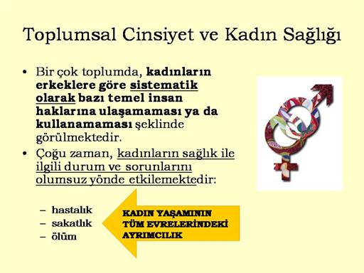 Görüldüğü gibi toplumsal cinsiyet, bir çok toplumda, kadınların erkeklere göre sistematik olarak bazı temel insan haklarına ulaşamaması ya da kullanamaması şeklinde görülmektedir. Bu durum da, çoğu zaman, kadınların sağlık ile ilgili durum ve sorunlarını olumsuz yönde etkilemektedir: hastalık, sakatlık ve ölümle sonuçlanmaktadır. Bu olumsuzluklar kadınların tüm yaşam evrelerinde izlenmektedir. |