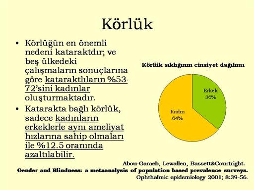 Dünya üzerinde 40-45 milyon kişiyi etkilemektedir. Önümüzdeki 25 yılda bu durum kontrol önlemleri geliştirilmezse ikiye katlanacaktır. Tüm dünyada kadınlar bu resmin yaklaşık üçte ikisini oluşturmaktadırlar. Bu ülkelerde körlüğün en önemli nedeni kataraktdır; ve beş ülkedeki çalışmaların sonuçlarına göre kataraktlıların %53-72’sini kadınlar oluşturmaktadır. Daha da önemlisi, kadınlar erkeklere benzer ameliyat hızlarına sahip değillerdir. Bir tahmine göre katarakta bağlı körlük sadece kadınların erkeklerle aynı ameliyat hızlarına sahip olmaları ile %12.5 oranında azaltılabilir.