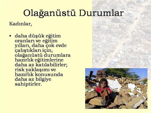 Yaklaşık iki milyar insan, 1990-1999 döneminde doğal ya da insan kaynaklı felaketlerden etkilenmiştir. Kadınlar, daha düşük eğitim oranları ve eğitim yılları, daha çok evde çalıştıkları için, olağanüstü durumlara hazırlık eğitimlerine daha az katılabilirler; risk yaklaşımı ve hazırlık konusunda daha az bilgiye sahiptirler. Felaket sırasında gerekli önlemler konusundaki yetersizlik ve felaket sonrasında da, gereksinimlerini ifade etme konusunda sürmektedir. *Bangladeş’deki 1998 selinde genç kızlar adet kanamalı kirli çamaşırlarını, utanma, baskı ve gözden uzak bir yer bulamama nedeniyle değiştirememişler; perine bölgelerinde dermatolojik problemler ve üriner enfeksiyonlar ile uğraşmışlardır. Kadınlar, felaket sonrasında, karar verme sürecinde sorunlar yaşamakta; bu durum bazen yaşamlarına mal olmaktadır. Yine Bangladeş’deki 2001 yılındaki bir kasırga sonrasında, evlerini boşalmak için kocasının gelmesini çocuklarıyla evlerinde bekleyen kadınların bir çoğunun can verdiği saptanmıştır. Kadınlar, felaket sonrası zarar görmüş konutlarda kalmaya çoğu zaman, istismar korkusu, kültürel ya da dini olarak ortak alanlarda olmalarının kısıtlanması gibi nedenlerle devam etmektedirler. Felaket sonrasındaki dönemde kadınları çok geniş bir yelpazede sorunlar beklemektedir. Bu sorunlar, İsrail’de yapılan bir çalışmanın sonuçlarında izlendiği üzere, deprem sonrası 48 saat içinde tüm doğum ve erken doğum hızlarındaki anlamlı bir artış olabildiği gibi, erkeğin ölümü ile sahip olunan malların korunmasının güçleşmesi, ve kadının yoksulluğa itilmesi de olabilmektedir. |