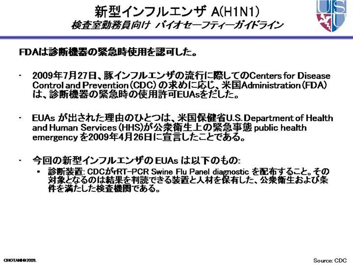 豚インフルエンザの人での流行を受け、FDAはインフルエンザ関連薬剤、診断機器の緊急使用を認可した。 [news release]. Rockville, MD: U.S. Food and Drug Administration. April 27, 2009. http://www.fda.gov/bbs/topics/NEWS/2009/NEW02002.html. アクセス2009年4月28日