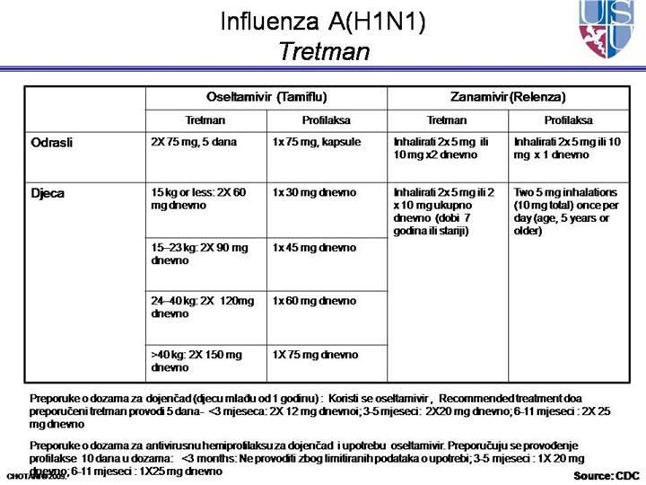 Trudnice Oseltamivir i zanamivir su u kategoriji "C" lijekova za trudnice, a to uključuje podatak da je provedeno ispitivanje o ovom lijeku u trudnoći. Zato što su nepoznati efekti antivirusnih lijekova na influencu u trudnica i njihovog fetusa, oseltamivir ili zanamivir ne bi trebalo koristiti u trudnoći. To važi i za profilaksu. Neželjeni efekti: http://www.cdc.gov/flu/professionals/antivirals/side-effects.htm |