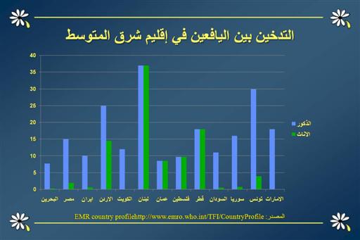 التدخين بين اليافعين الذكور اعلى من الاناث ما عدا في قطر ولبنان وفلسطين ولبنان حيث ان النسب متساوية