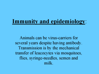 | Diagnosis: Serum antibody by immunodiffusion using formalinised infected horse spleen as antigen (the Coggins test). This also is done before horses are allowed to race in the USA. Viral antigen in the spleen of a dead animal is detected by IIF. |