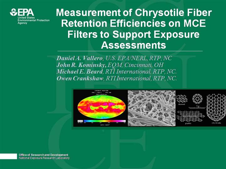 completed and published: Vallero, D.A. Kominsky, J.R., Beard, M.E. and Crankshaw, O.S. Comparison of chrysotile asbestos collection efficiencies on mixed-cellulose ester filters. Journal of Occupational and Environmental Hygiene. 6 (1): 62-72. 2009. |