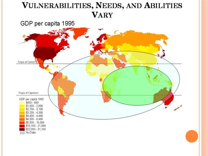 The circles demonstrate overlapping the concentration of water emergencies. More money means more abilities which means that responses to disasters are improving. Higher risk of water events means more need. How well a country is organized determines the level of vulnerability, hence the importance of preparedness and training for nurses. |