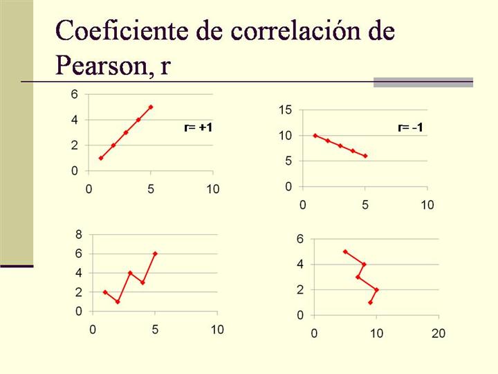 Si el coeficiente de correlación es -1 o +1,los puntos en la gráfica de puntos dispersos estarán en una línea recta. La correlación es positiva si altos valores de una variable están asociados con altos valores de la otra variable, pero los puntos no tienen que caer exactamente en una línea recta. La correlación es negativa si valores de una variable disminuyen conforme los valores de la otra variable aumentan, pero los puntos no tienen que caer en una línea recta.